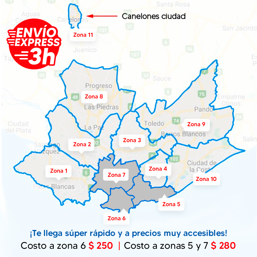 Zonas de Cobertura en Montevideo: Las zonas de cobertura son las 5, 6 y 7 marcadas en el plano. Si al momento de comprar, cargas una dirección perteneciente a una de esas zonas, se te ofrecerá la posibilidad de solicitar éste envío.