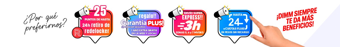 Y recuerde que TODO lo que compre en la WEB o en el LOCAL, va con 1 AÑO EXTRA de Garantía de regalo!. La Garantía PLUS! es un beneficio que DIMM otorga a los clientes que lo prefieren, en cualquier punto del país. (No participan de la promoción los productos sin garantía o con garantía funcional).